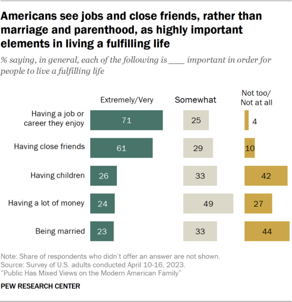 A study by Pew Research found that a whopping 71% of Americans think that having a job or career they enjoy is extremely or very important in order for people to live a fulfilling life. 61% of those said that having close friends is extremely important. Whereas only 24% said that having a lot of money is the most important.
